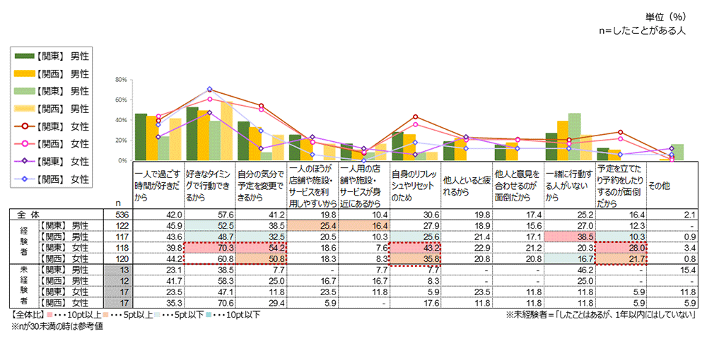 女性は、好きなタイミングで行動できたり、気分で予定を変更できる点や、予定を立てることが面倒な人で、リフレッシュやリセットしたい時に、ひとりで行動をする人が多い。女性は男性より、人に気を遣うことにストレスを感じる人が多いものと推察される。