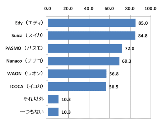 非接触型の電子マネーサービス名称の認知状況を尋ねたところ、全体では「Edy」が最も多く、85.0%を占めた。次いで、「Suica」の84.8%、「PASMO」の72.0%と続いている。「一つもない」と回答した人の割合は10.3%にとどまっている。
