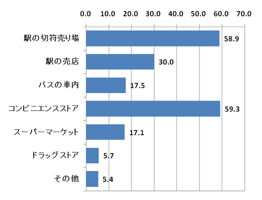 非接触型の電子マネーの保有者かつ使用経験者に使用する場所を尋ねたところ、全体では「コンビニエンスストア」が最も多く、59.3%を占めた。次いで、「駅の切符売り場」の58.9%、「駅の売店」の30.0%と続いている。