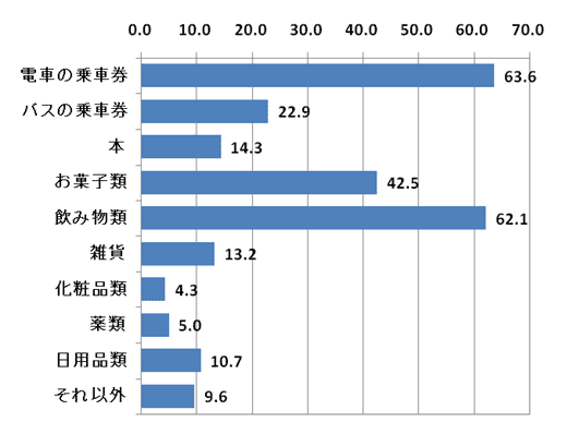 非接触型の電子マネーの保有者かつ使用経験者によく購入するものを尋ねたところ、全体では「電車の乗車券」が最も多く、63.6%を占めた。次いで、「飲み物類」の62.1%、「お菓子類」の42.5%と続いている。