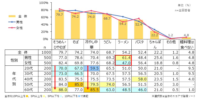 冷たい麺類は年齢が高いほど人気、「ラーメン」は喫食状況で男女差が最も大きい