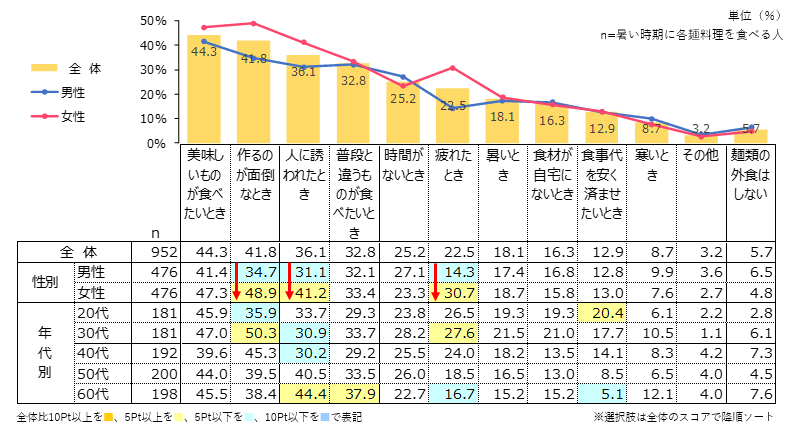 また、「ラーメン」は男女差が最も大きい。男性は暑くてもラーメンを好んで食べる人が多い。