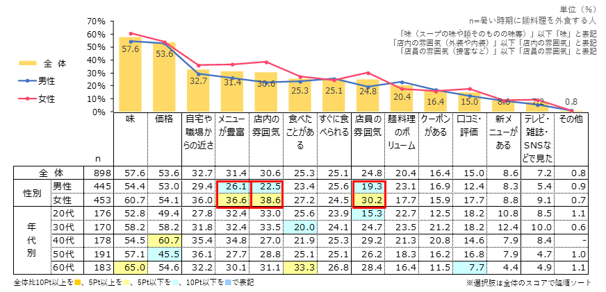 また、60代は「味」「食べたことがある」が他の年代より高く、「口コミ・評価」が低い。周りからの評価には左右されず、お店の料理への信頼感からお店を判断していると推察される。