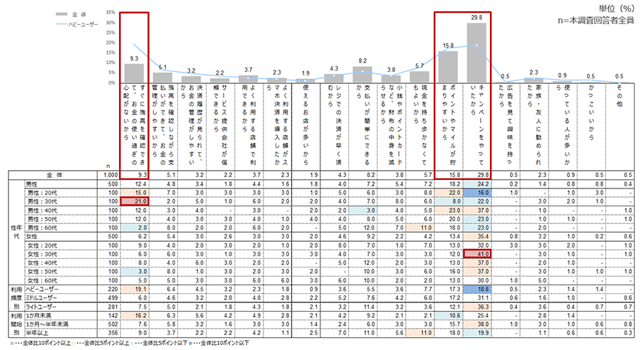 「キャンペーンをやっていたから」が最も高く、30%。次点で、「ポイントやマイルが貯まりやすいから」「すぐに残高を確認できて、お金の使い過ぎの心配がないから」と続く。