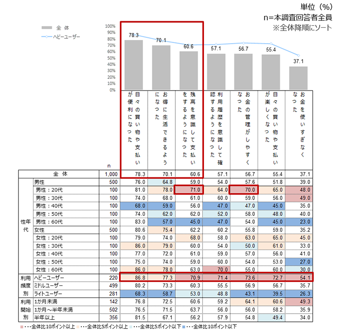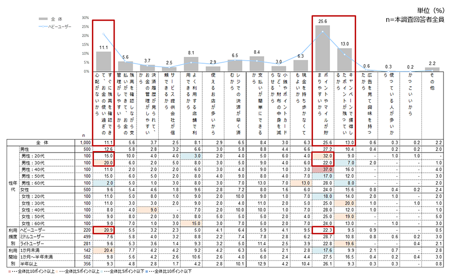 ヘビーユーザーは、『便利』『お得』『残高意識』を含むすべての項目で、全体を上回る。