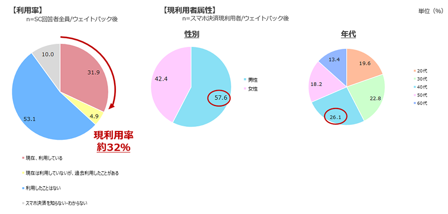 スマホ決済の現利用率は約32%、現利用者の属性を見ると、男性が58%で、女性より男性の方が多い