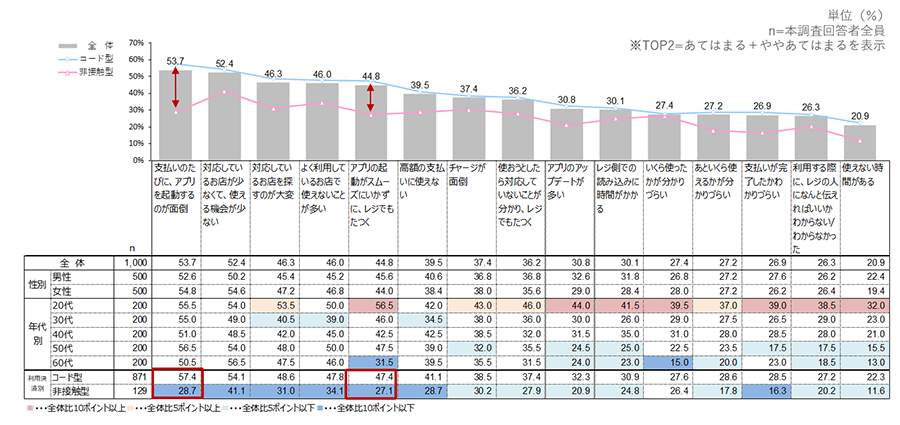 支払時のアプリの起動が面倒なこと、レジでもたつくことが、コード型と非接触型で大きな差がみられる。コード型はアプリ起動というステップの煩わしさがストレスに繋がっているものと考えられる。