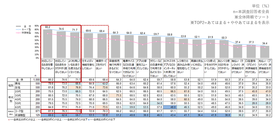 全体的に、非接触型よりもコード型で「改善・追加」要望が高いことがわかる。 特に、利用可能店舗の拡大とセキュリティ関連が、コード型利用者からの「改善・追加」への要望が高い。