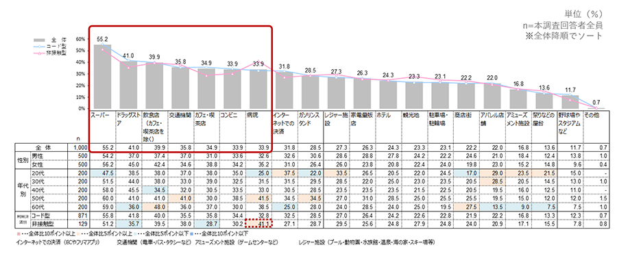 今後は日常の買い物だけでなく、飲食・交通機関・病院など生活全般で利用したい意向がうかがえる。非接触型では、病院がスーパーに次いで高い結果となった。
