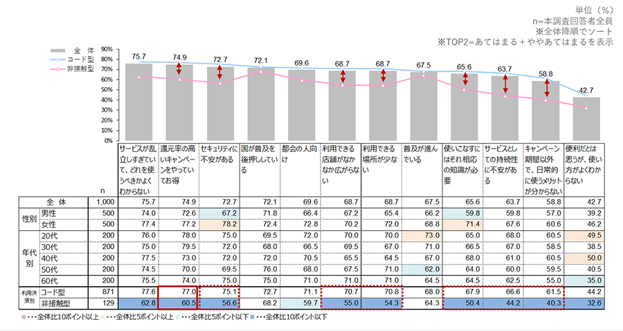 コード型は、お得感が高い一方、セキュリティへの不安、利用できる場所の少なさ、使い方や持続性への不安等、非接触型と比べネガティブなイメージが強い。キャンペーンの実施で急激に普及したものの、利用者はまだ不安や不便を感じている様子。