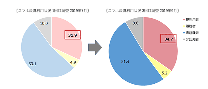 現利用者は3割半ば。第一回調査(2019年7月時点)より利用者は増加しており、スマホ決済市場は今後も拡大すると予想される。