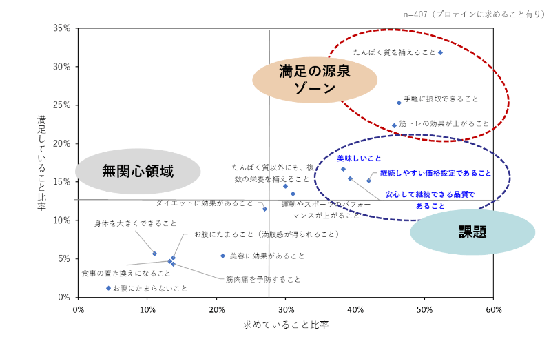 求める度合いと満足度合いの関係をみると、「たんぱく質を補える」「手軽さ」など機能面についてはいずれも高く、満足の源泉となっている。一方、「美味しさ」 「安心できる品質」「継続しやすい価格」はいずれも求める度合いは高いが、満足度合いは2割未満にとどまったことから、今後の課題であると言える。