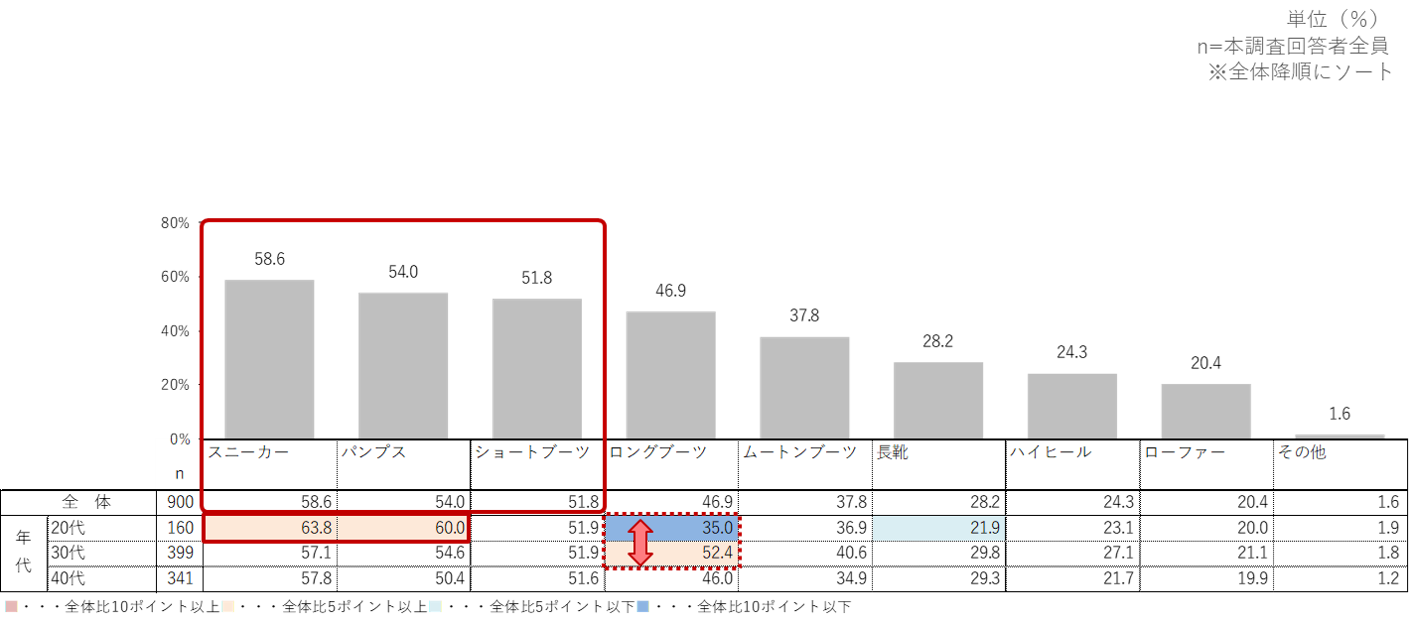 20代はスニーカーとパンプスが他の年代に比べ高い。ロングブーツは20代と30代で大きな開きがみられたが、そもそも20代はロングブーツを履いていないと推察される。