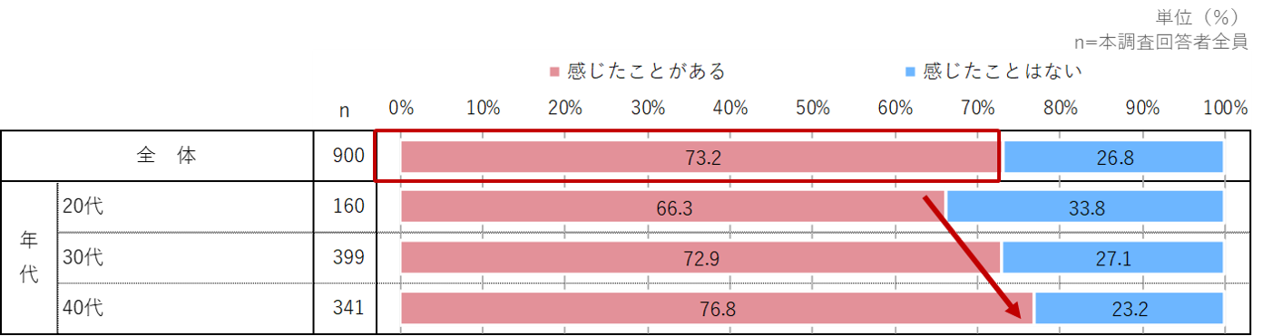 同性の足のニオイに対して、臭いと感じたことがある人が多く、また年代が上がるほど臭いと感じたことがある割合が高くなる。なかでも、居酒屋や飲食店の座敷で靴を脱いだ時に臭いと感じたというエピソードが多くみられた。また、職場で靴を履き替えた瞬間にニオイがしたなど、女性は同性の足のニオイを臭いと感じることが多いと言える。