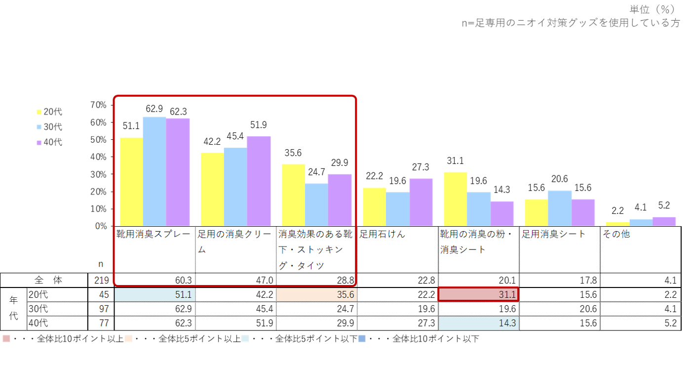 - 20代は足のニオイ対策グッズを併用しており、足のニオイに敏感である