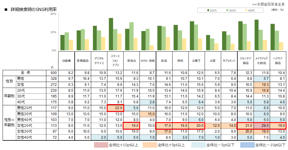 女性20代は、他の属性に比べて、メイクアップ化粧品・スキンケア製品・お菓子・ヘアケア製品・飲食店のリサーチにSNSを活用している。男性では20代で、スマホアプリの検索にSNSが活用されている。