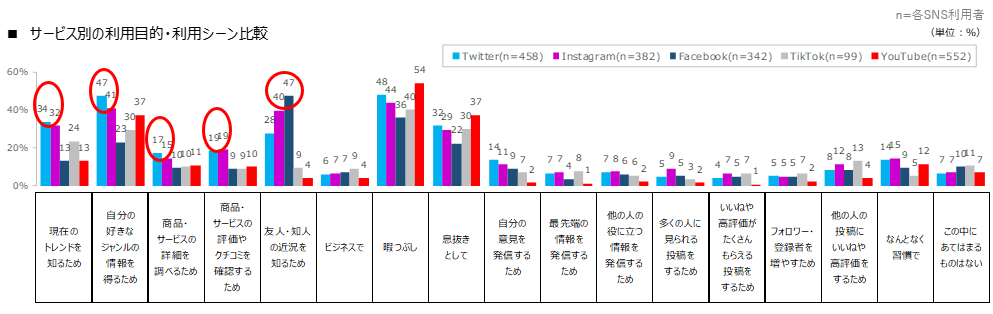 各サービスの利用者全体で見ると、情報収集はTwitter・Instagram、友人知人の近況確認はFacebook・Instagramと目的によってサービスの使い分けがされているが、20代では、情報収集も友人知人の近況確認もTwitter・Instagramに集中している。