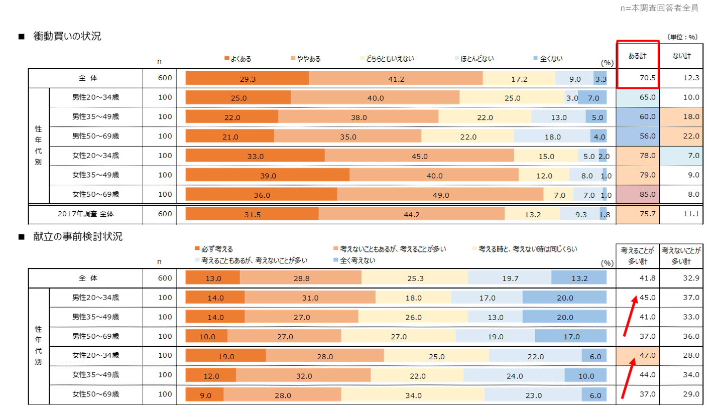約7割が衝動買いをしており、依然スーパーマーケットでは衝動買いが行われているものの、増税前と比べると、その数は減少している。