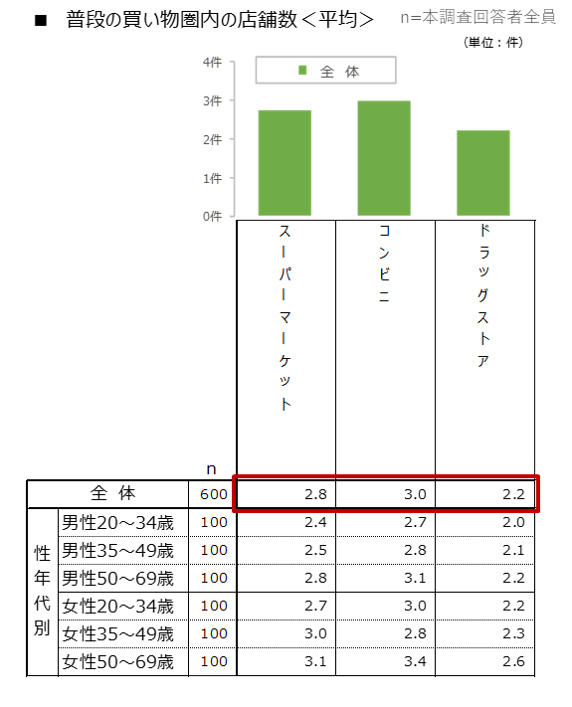 Q.あなたのご自宅の周辺(普段の買い物圏内)に、スーパーマーケットやコンビニ、ドラッグストアは何店舗ありますか。