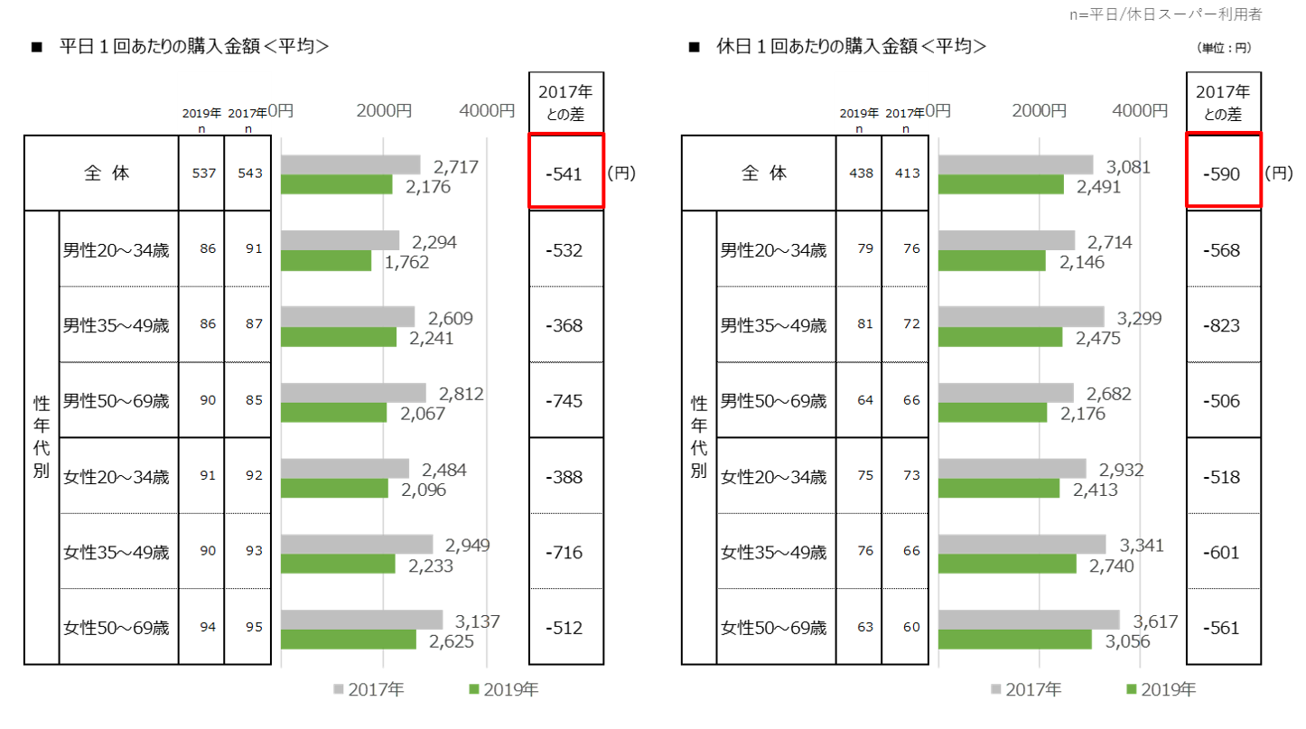 1回あたりの平均購入金額は平日2,176円、休日2,491円であり、平日・休日ともに増税前と比べて、500円以上減少。