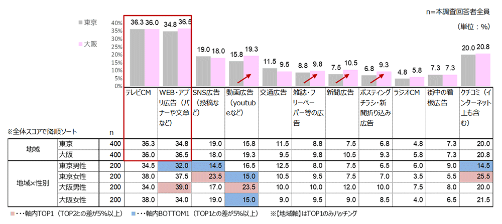 - 大阪は東京に比べて広告の接触をきっかけに商品を購入する人が多い