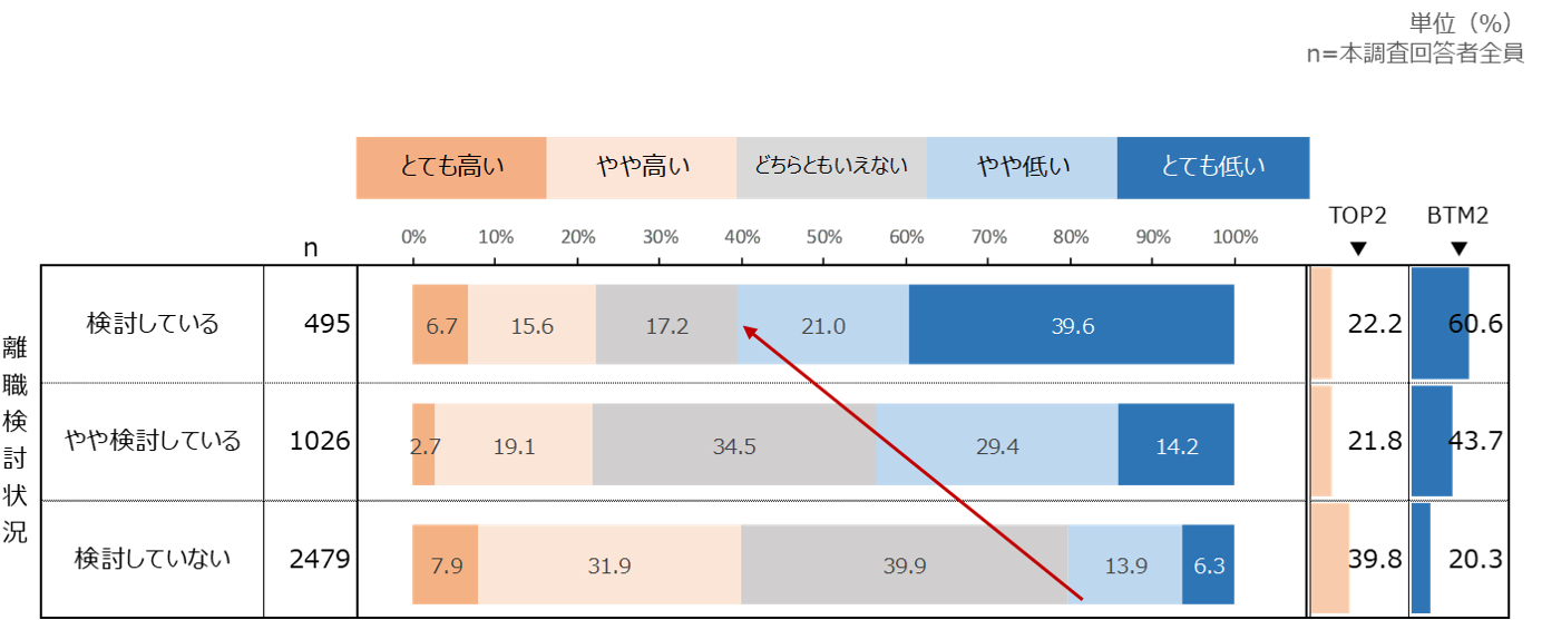 離職を検討している人の6割が低モチベーションで、離職を検討していない人に比べるとその差は顕著。