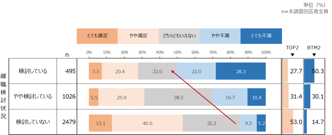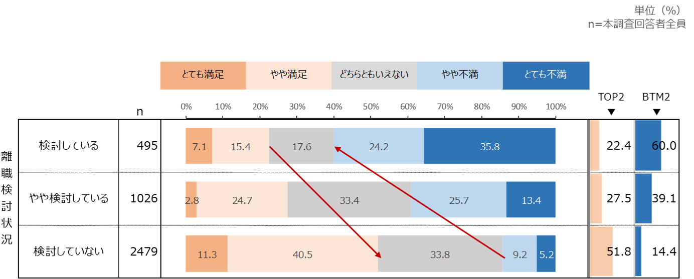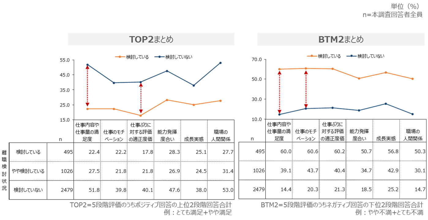 離職を検討している人は、成長実感や人間関係等総合的に満足度が低い
