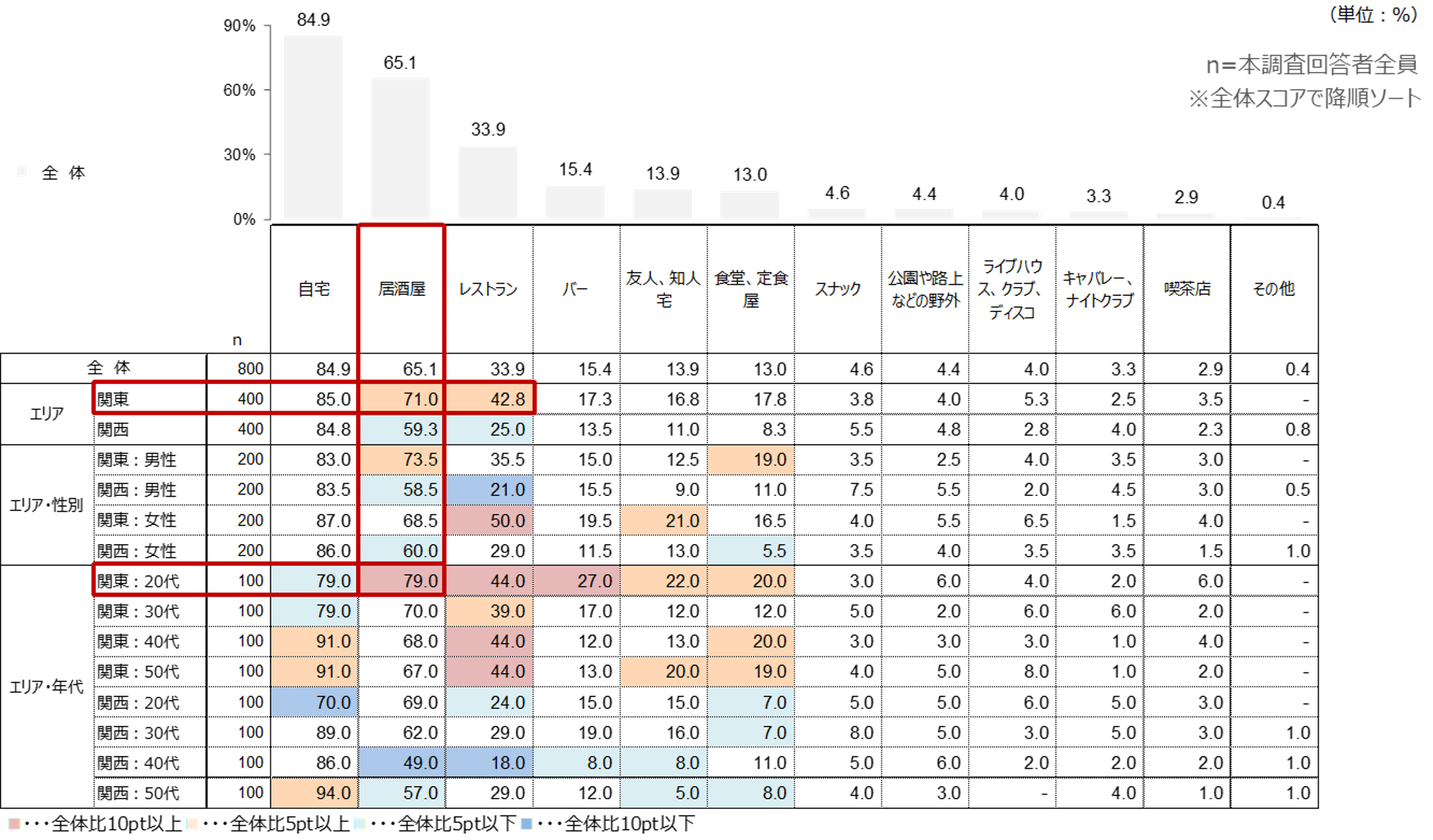 外出自粛の影響も受けてか、全体的には東西共に自宅での飲酒が一番高いが、関東人はレストランの利用が多い。