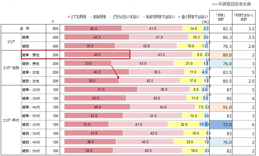 男性は、関西に比べて関東の方がお酒を「とても好き」と答える。