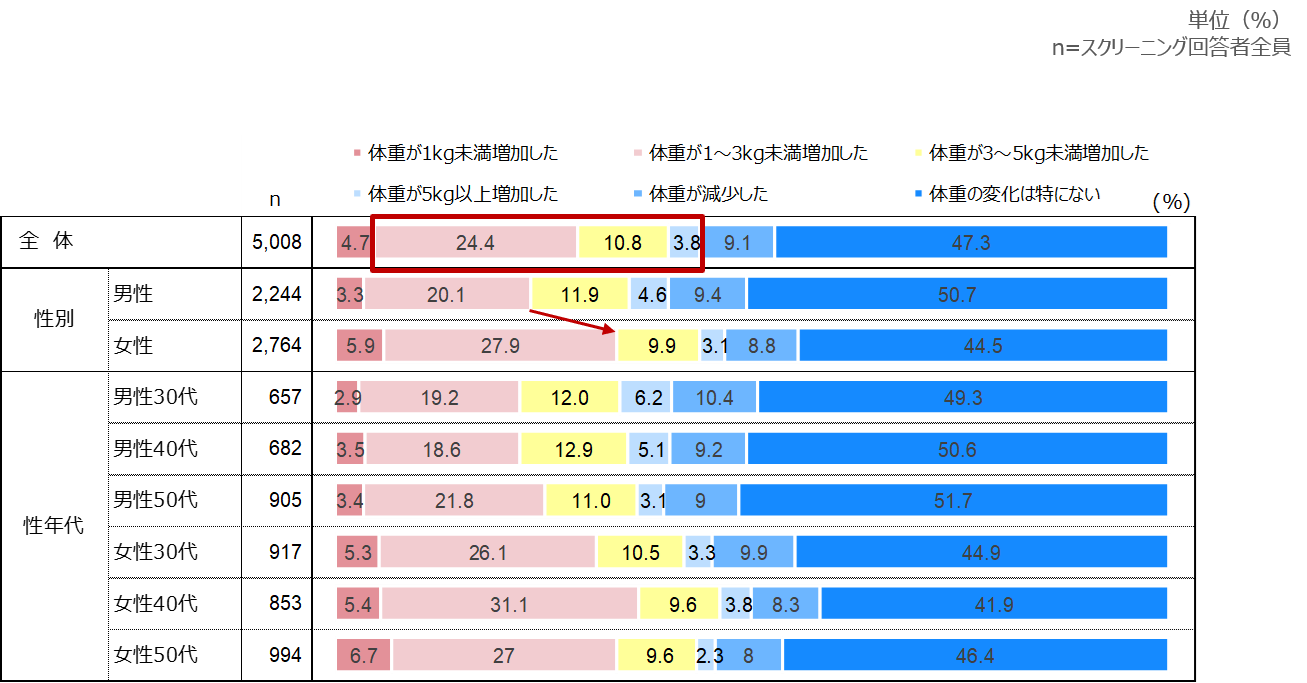 新型コロナウイルスの影響により、1kg以上の”コロナ太り”をした人は約4割。男性より女性で顕著。