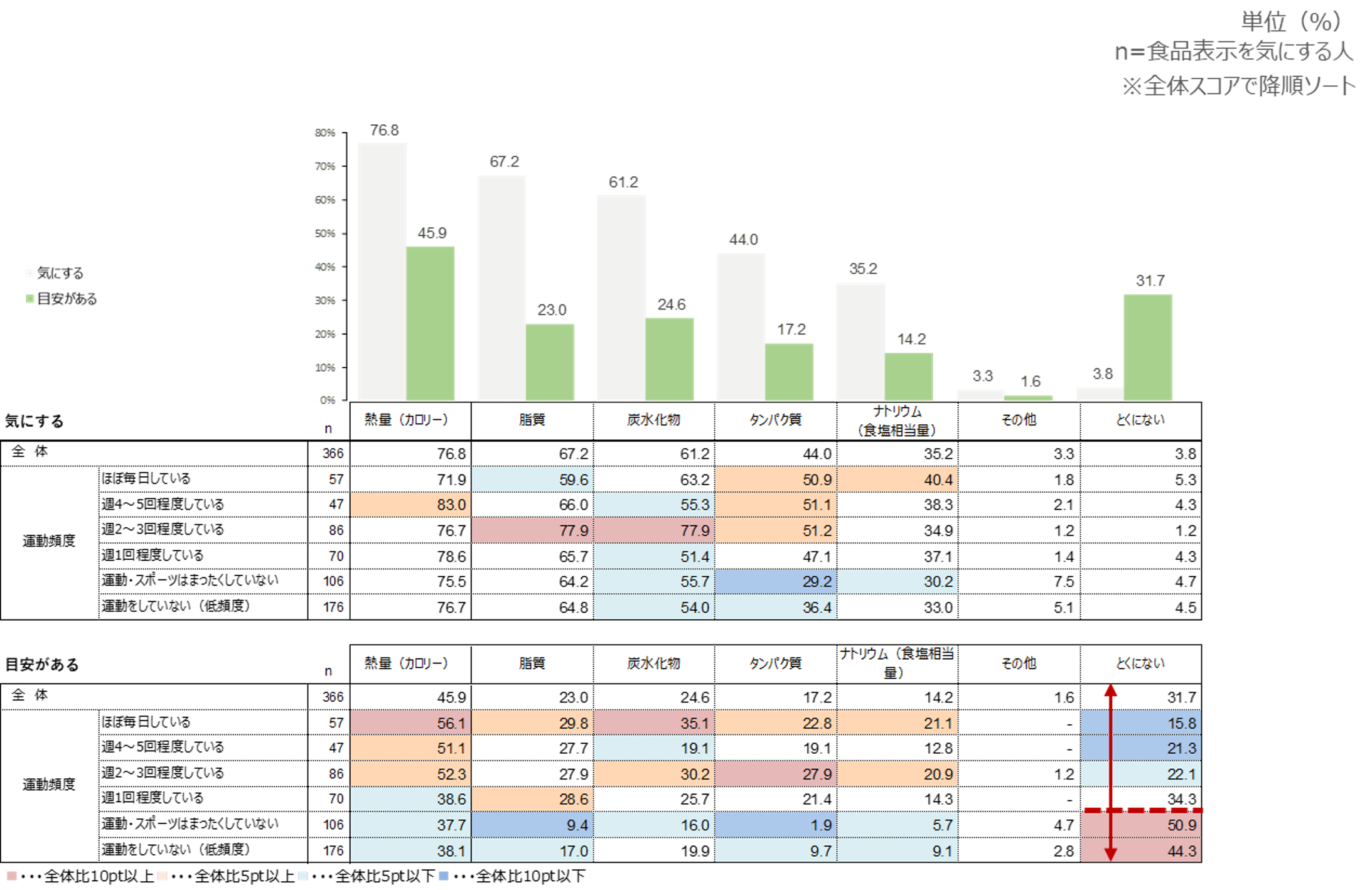 週1回以上の運動頻度の人は、食品表示項目の目安値を持っている割合が高く、運動をしない人は、気にする食品表示項目があるものの、明確な目安値を持っていない。