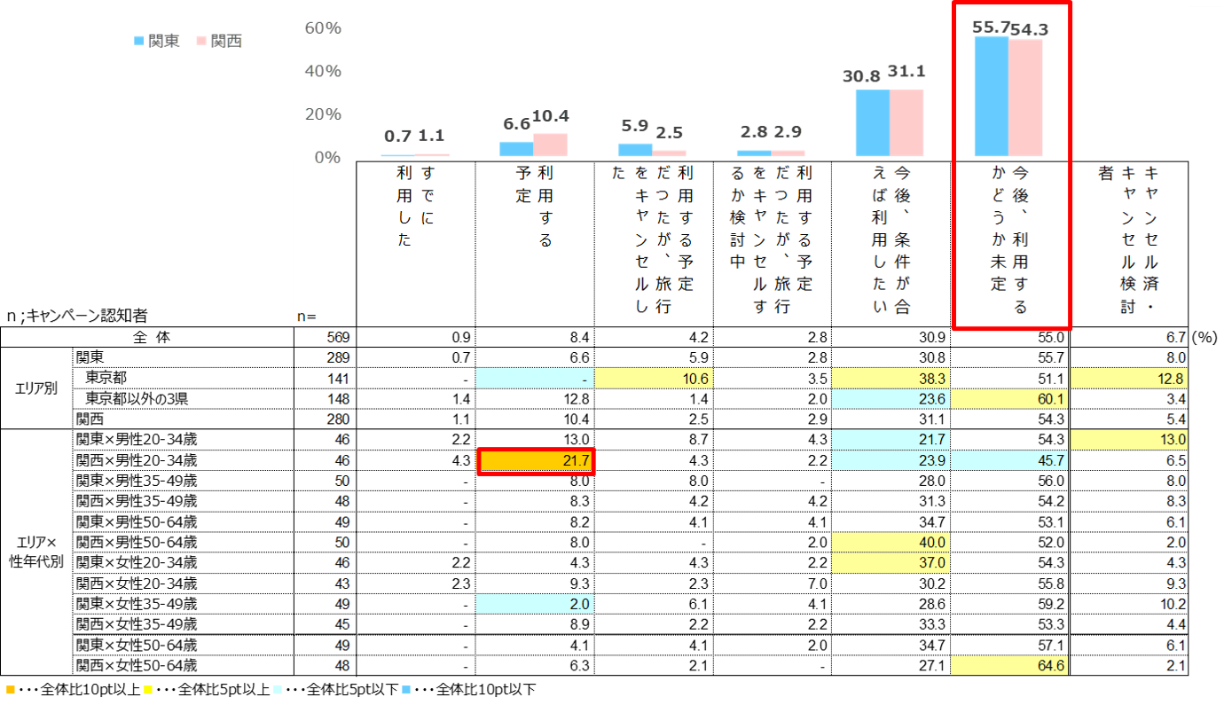 特に関西の男性20-34歳において高く、他の性年代に比べてキャンペーン利用に意欲的と考えられる。