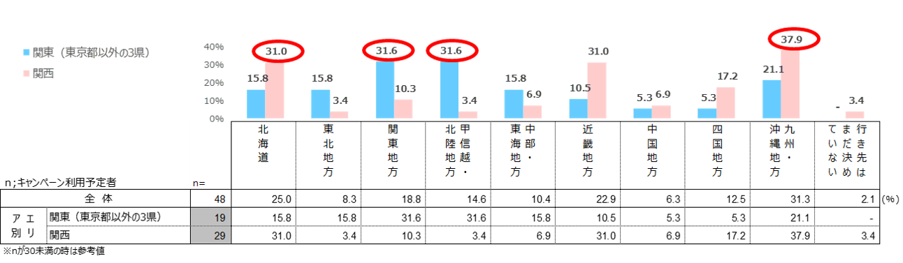 利用意向者が行きたいエリアは、関東では「関東地方」が最も高いのに対し、関西は近隣エリアよりも「九州・沖縄地方」が最も高い。また、「北海道」や「九州・沖縄地方」は、関東・関西に関わらず、旅行先として人気が高いことがうかがえる。キャンペーン利用予定者において、関東では「関東地方」や「甲信越・北陸」など近隣エリアを旅行先としているのに対し、関西は近隣エリアに加え、「北海道」や「九州・沖縄地方」が旅行先としてあがっている。(※30サンプル未満のため参考値)