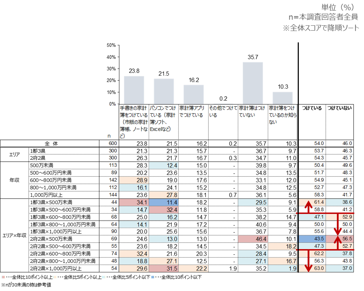 - 世帯年収600万円で東西の家計簿を付ける割合が逆転する