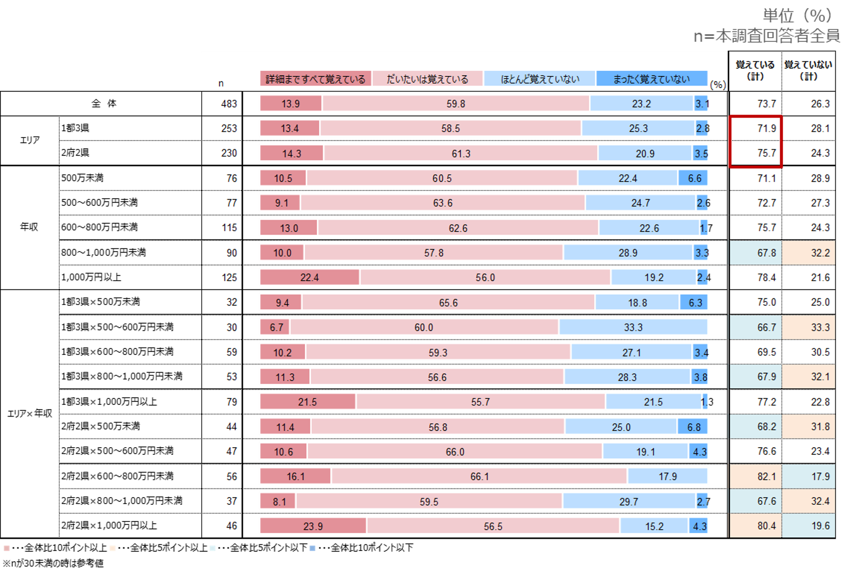 世帯年収1,000万円以上で「詳細まで全て覚えている」割合が急増する。