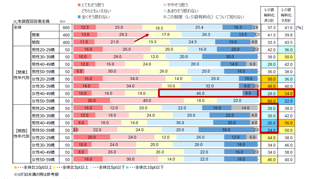関東女性は比較的レジ袋の有料化に肯定的だが、40代のみネガティブの割合が高い。