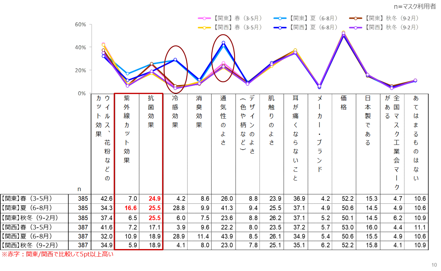 関東は、関西よりも「紫外線カット効果」「抗菌効果」をやや重視する様子がみられる。
