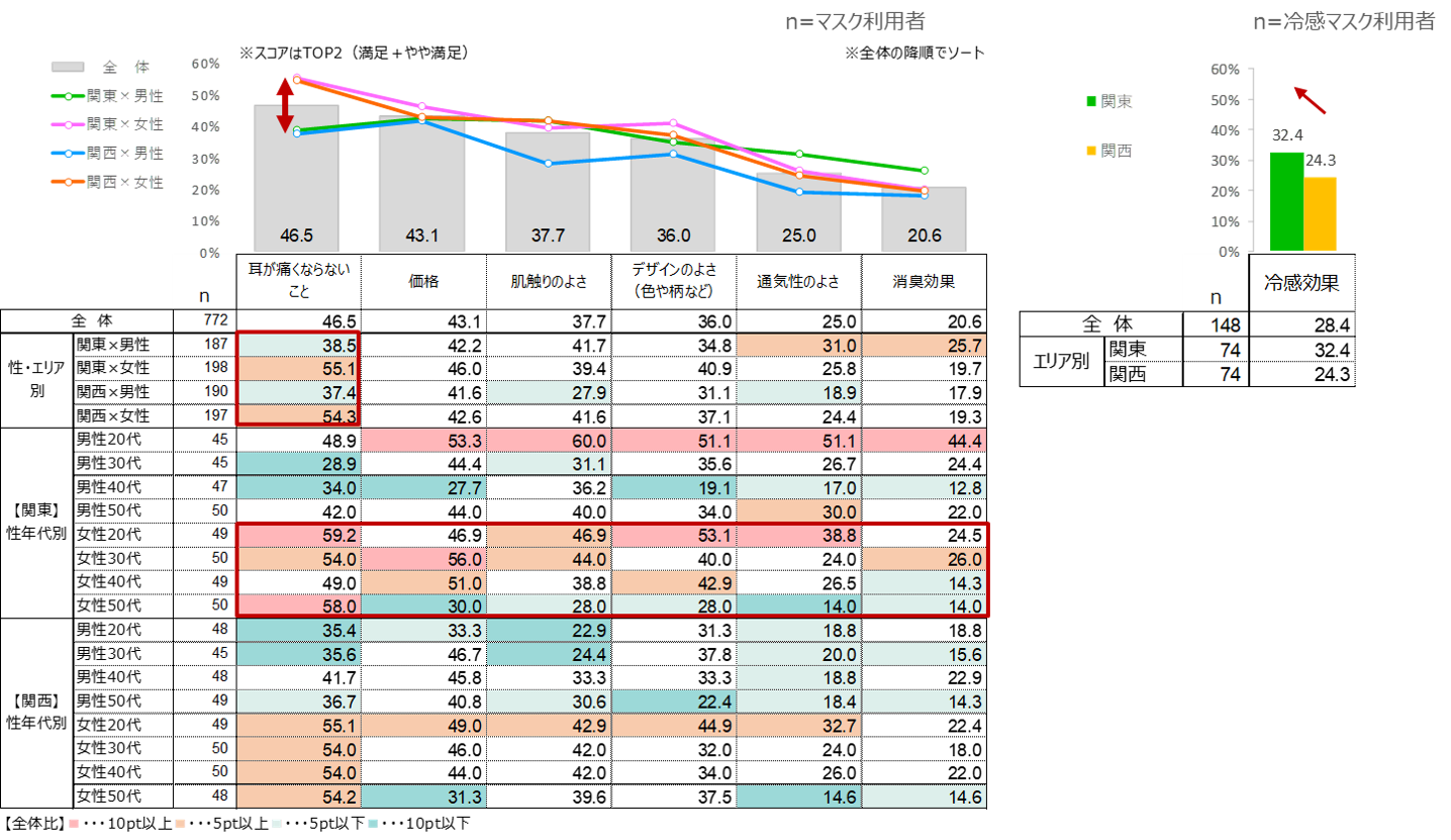 総じて女性の方がマスクの満足度は高い傾向にあることから、男性はマスクなら何でもよく、こだわりがない無頓着タイプが多いために満足という考えを持たないのではないかと考えられる。一方、女性はこだわりを持っている人が多いと推察される。