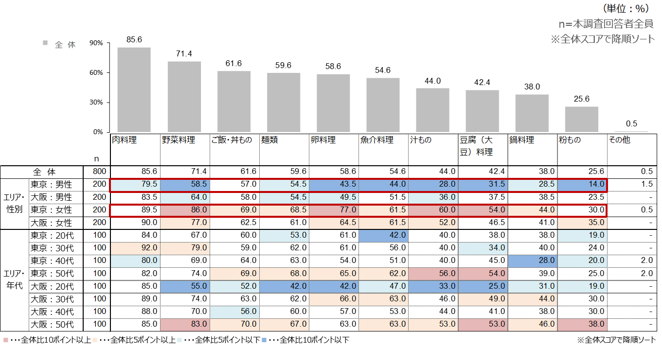 多くのメニューにおいて東京の男性は大阪に比べ、調理をしない傾向にある。一方、東京の男性に比べて女性は幅広いバリエーションの食事を作る。
