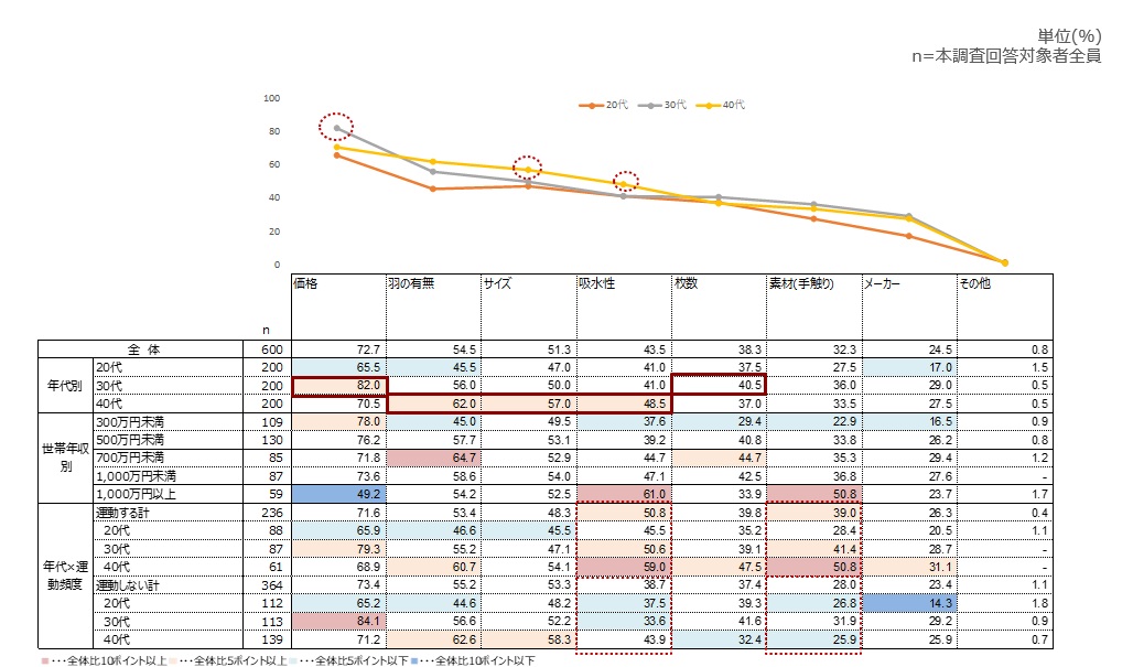 運動をする人は「吸水性」や「素材(手触り)」にこだわる傾向がみられる。