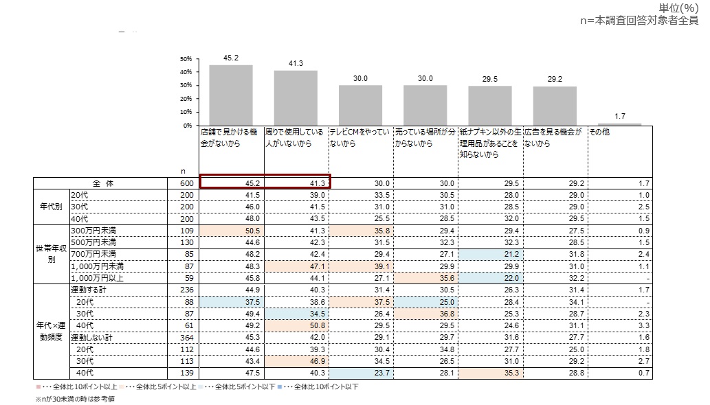 「布ナプキン」の認知度が低いのは、知るきっかけがないため、店頭で見かけないことが最も大きな要因