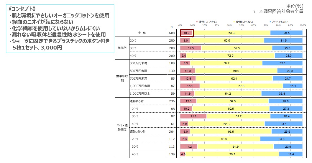 そこで、年代別の認知度や使用意向を調べ、生理用品を使う女性の実態を調べました。