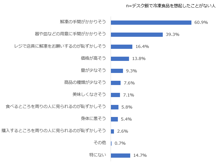 これらが、冷凍食品がデスク飯メニューとして採用されるための障壁だと推察。