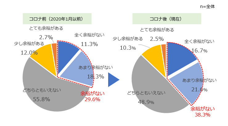 - コロナ前後で経済的な”ゆとり”がない人の割合が、29.6%→38.3%へ増加