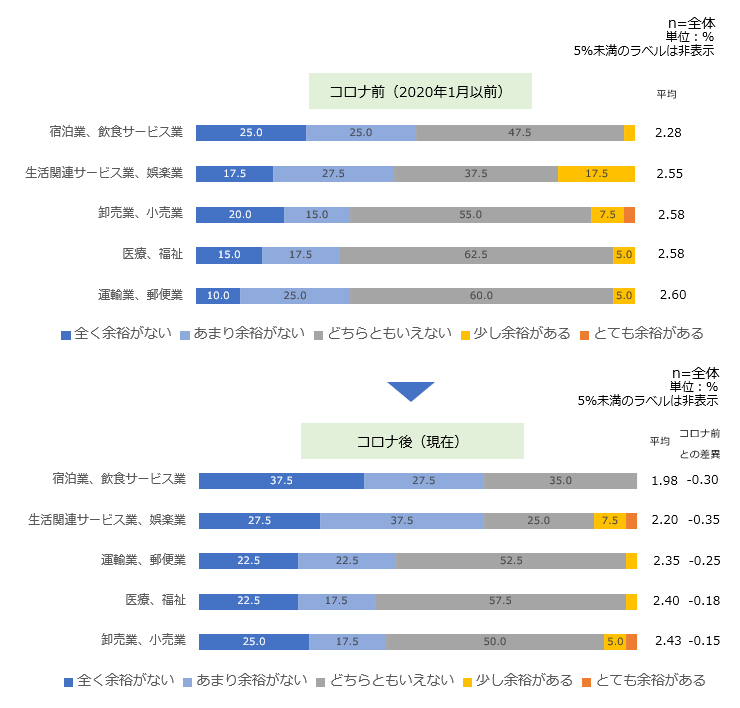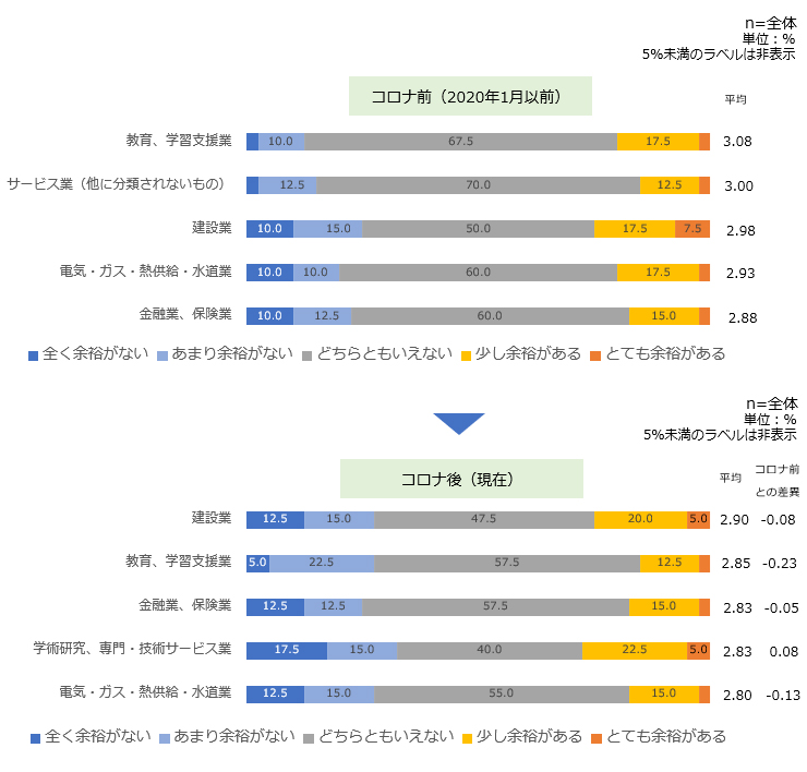 - コロナ前後でも”ゆとり”がある/ない上位5つの業種はほぼ変わらない