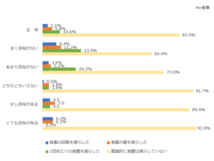 経済的な”ゆとり”が全くない人の3割以上が、コロナ後でなにかしら食費を抑えるようになった。