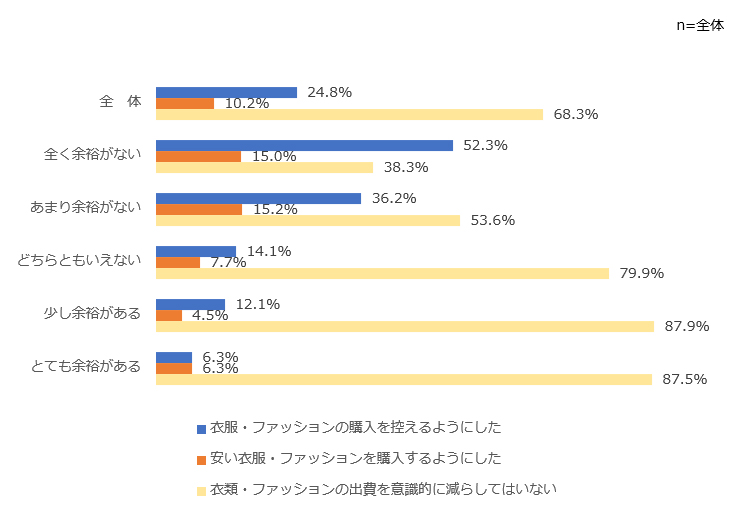 経済的な”ゆとり”に全く余裕がない人の6割以上が、コロナ後で衣類・ファッションへの出費を抑えるようになっている。