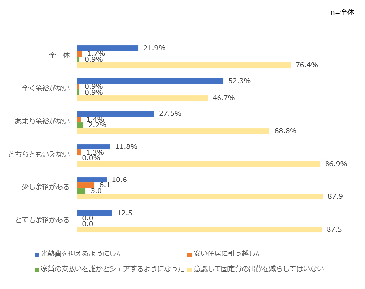 経済的な”ゆとり”に全く余裕がない人の半数以上が、コロナ後で光熱費を抑えるようになっている。