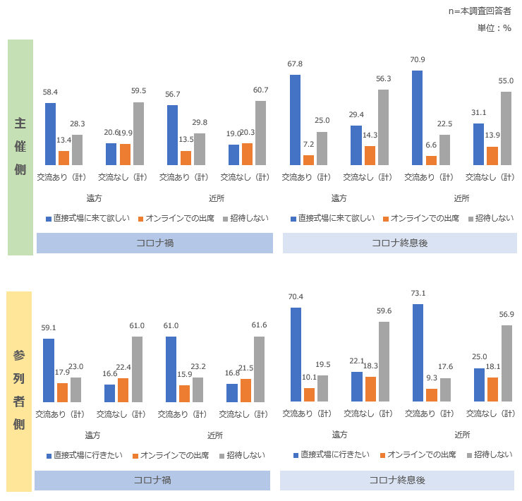 - 主催側・参列者側ともに、コロナ影響や物理的距離に関わらず、「直接式場に来て欲しい(行きたい)」が大半