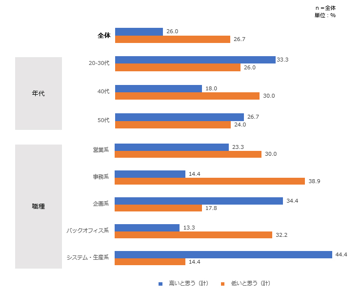 職種別では、「営業系」「事務系」「バックオフィス系」が低い。